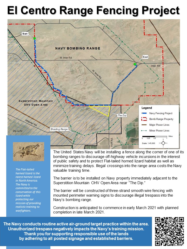 As you may be aware, the Navy has constructed a fencing project along the Superstition Mountain OHV Open Area and Rage boundary in the area known as the "DIP." The installation is sharing details of the project and would appreciate your cooperation getting the message out.