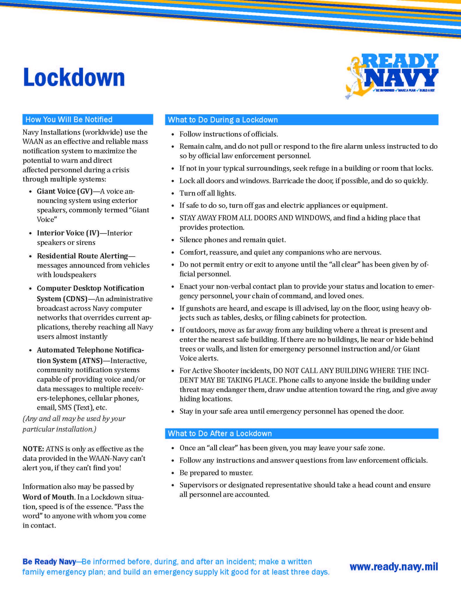 What is the difference between "Lockdown" and "Shelter-in-Place?" A Lockdown, like Shelter-in-Place, is a temporary sheltering technique to limit exposure to threat, usually an Anti-Terrorism Force Protection incident such as an Active Shooter Incident. It is immediate movement or removal of all personnel from the outside to inside structures. When alerted, occupants of any building within the subject area will silence all phones and devices, lock all access, windows, doors, etc., to prevent entry or exit to anyone until the “all-clear” has sounded. A Lockdown can last a few minutes or several hours, depending on the severity of the situation.
