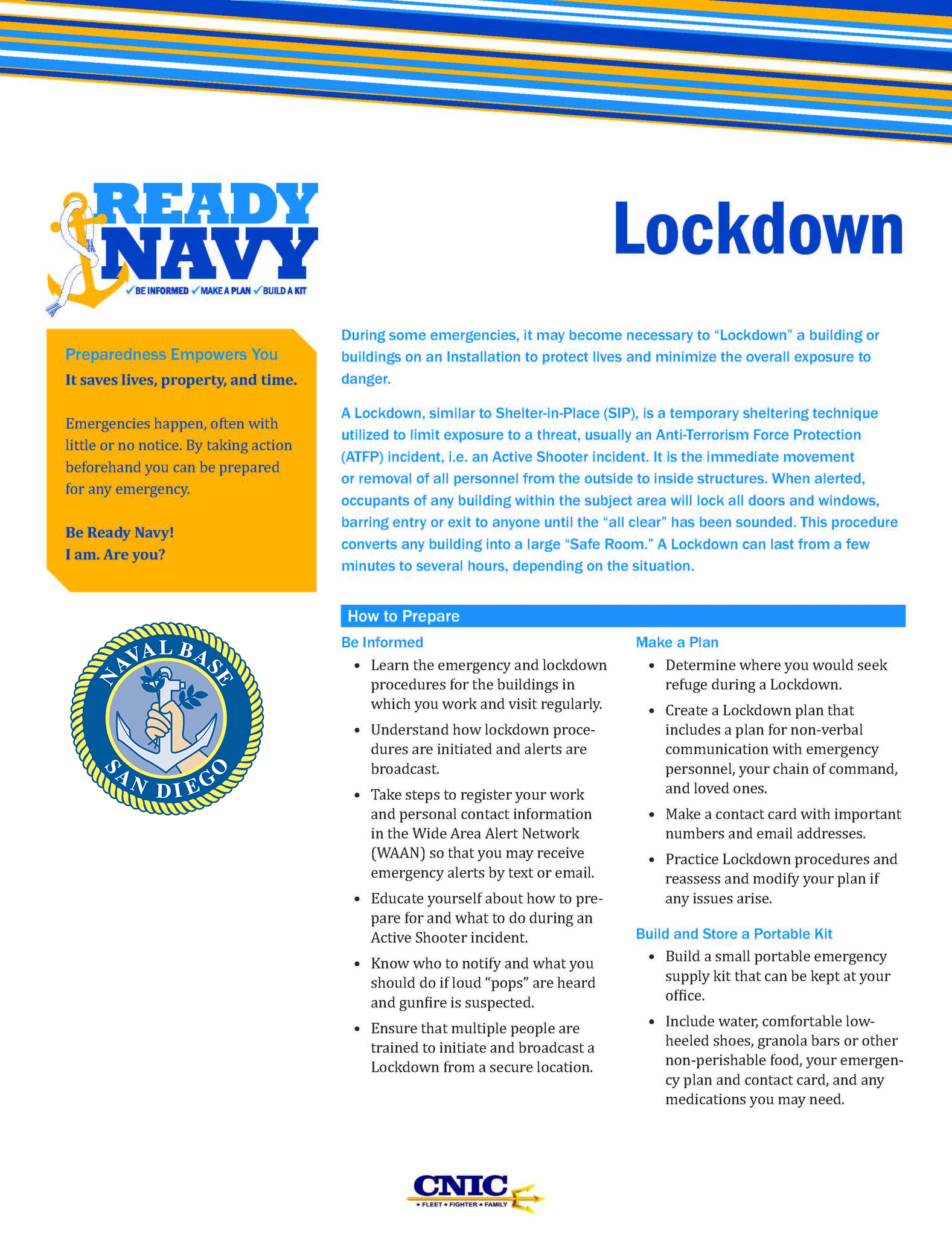 During some emergencies, it may become necessary to “Lockdown” a building on an installation to protect lives and minimize the exposure to danger.